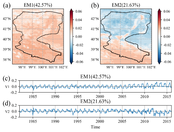 图2. NDVI两个最大本征微观态的空间分布(a, b)及其时间演变(c, d)。