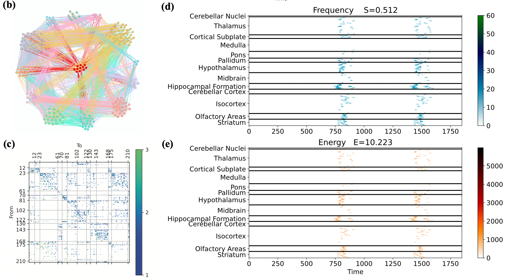 研究采用经典的Epileptor模型,构建异质性大规模脑网络系统,通过引入不同拓扑结构(Small-World、Scale-Free、Random网络),系统模拟癫痫的传播动力学。同时,特别引入了两个全局指标:同步性指标(S):衡量网络内癫痫发作的同步程度;能量指标(E):反映系统中癫痫活动的强度水平。结合Allen小鼠脑连接组图谱。进一步验证了该方法在真实生物连接数据上的适用性与有效性。