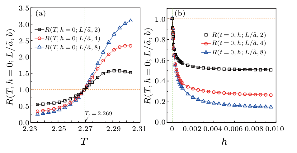 图三:对二维伊辛系统,通过确定重整化变换后的R函数的不动点,可以获得系统的临界温度(a)和临界外场强度(b)。