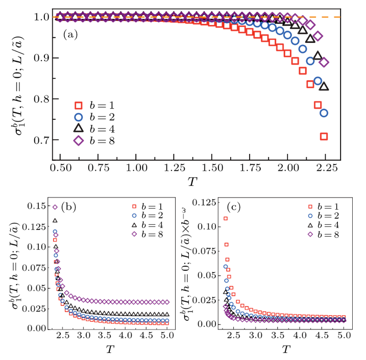 )体现出的低温不动点(a)和高温不动点(b,c),以及其满足的标度形式