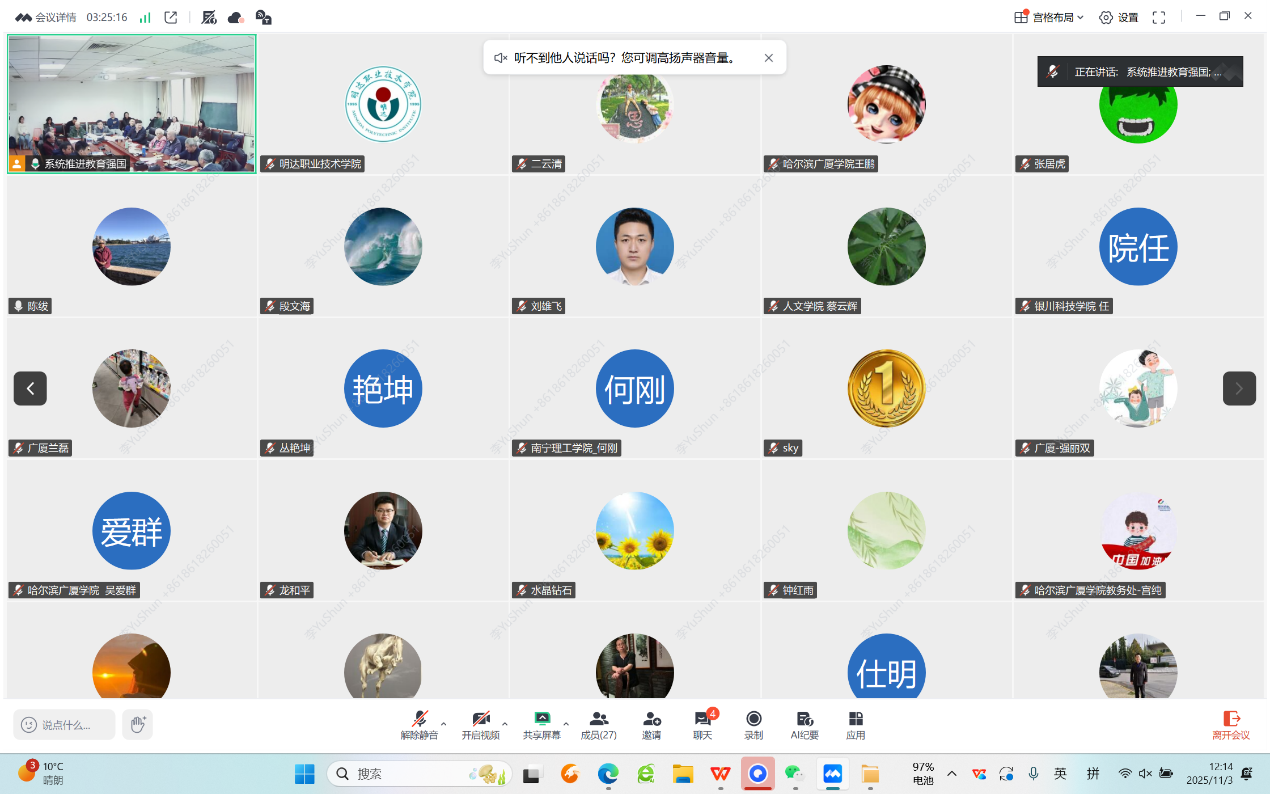 2025年11月3日,由日韩av 及数字学习与教育公共服务教育部工程研究中心教育系统工程委员会联合主办的“系统推进中国式现代化教育强国”系列讨论第一次活动正式开启,日韩av 王大辉教授和数字学习与教育公共服务教育部工程研究中心副主任李玉顺教授出席了本次讨论。来自校内外共75名专家学者参与了本次讨论,其中28人线下参加,47名通过腾讯会议线上参加。