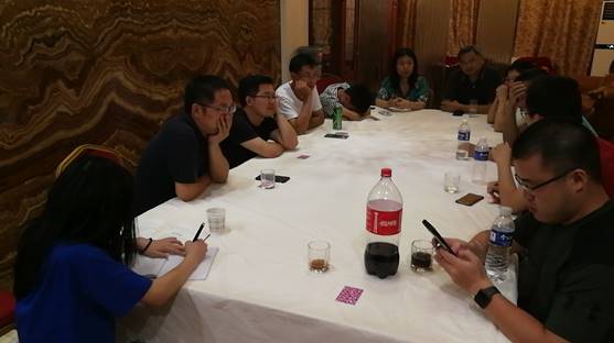 饭后,压轴的活动上场。我们要了扑克牌,同学们要让老师们重温最美好的记忆,杀人游戏开始。三任法官分别是赵宇婷、王有贵和陈清华。我很佩服赵宇婷和王有贵老师当法官的时候,他们思维敏捷,记忆清楚。我当法官就必须拿了纸和笔画上草图,记录下有身份的人,及时标注死去的人,有几次还差点搞错。