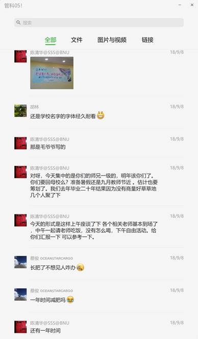 这样断断续续讨论了大半年,在原来的班长郭金忠和赵宇婷的组织下,大家纷纷献计献策。但一个关键问题一直迟迟未得到解决,到底是7月份还是8月份,具体到哪一天呢那就更不能达成一致。想到我们物理系2017年毕业20周年的活动就是因为没有定好时间而未能圆满完成,我很担心他们出现类似的情况,就一再催他们尽快决定,但集体的决定总是千呼万唤不出来。